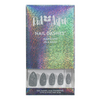 Hettie's Tinsel medium almond press on nails come in a silver shiny finish with a glitter nail design.