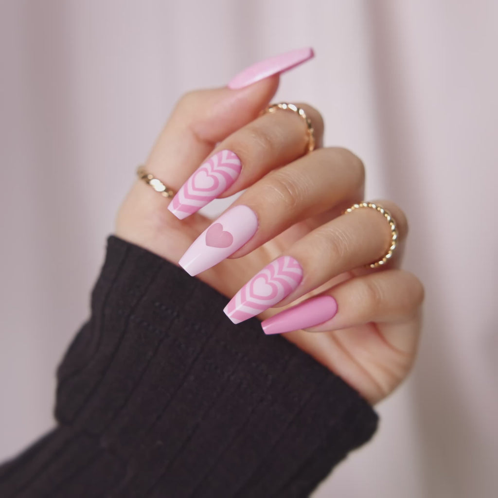 Heartthrob Harley extra long ballerina press on nails come in a pink shiny finish with a glitter and hearts nail design.