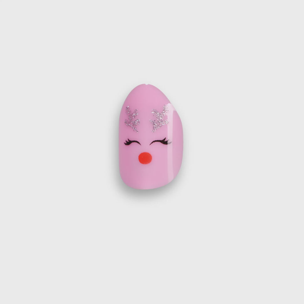 Santa's Squad: Arcie, Roman, and Rudolph petite almond press on nails come in a pink and red shiny finish with a glitter, reindeer, and candy cane nail design.