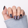 Kambrynn's Lessons in Fearlessness short square press on nails come in a purple shiny finish with a cat eye nail design.