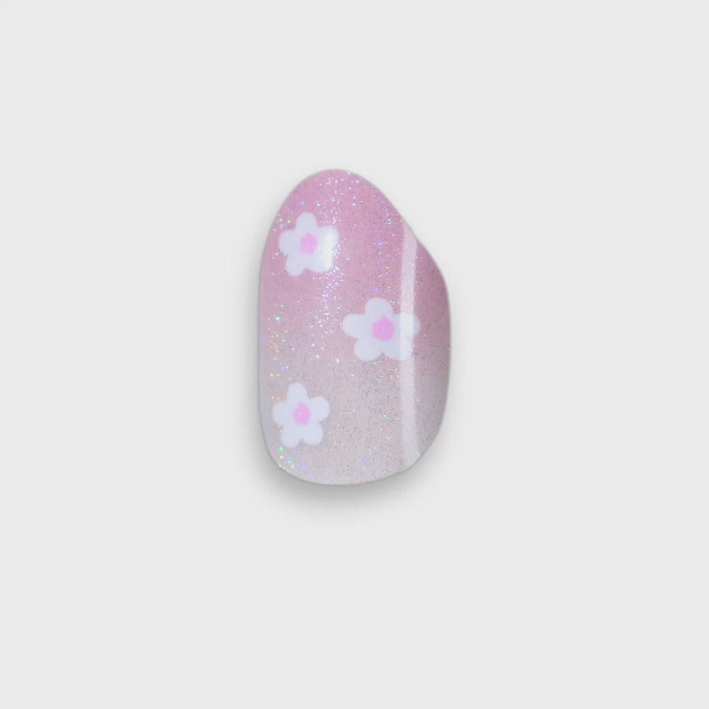 Besties in Bloom, Keke petite almond press on nails come in a pink shiny finish with an ombre, glitter, and flower nail design.