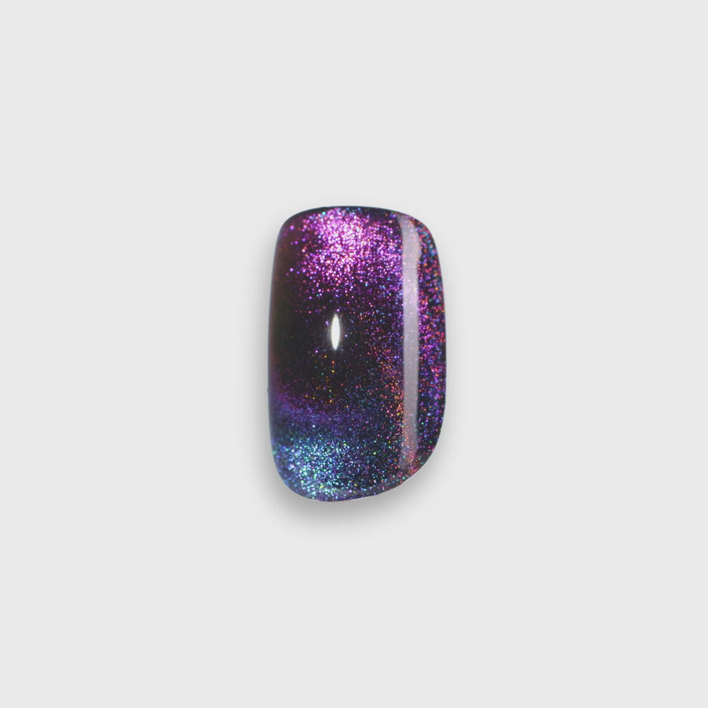 Aquila short squoval press on nails come in a multicolor shiny finish with an acrylic and cat eye nail design.
