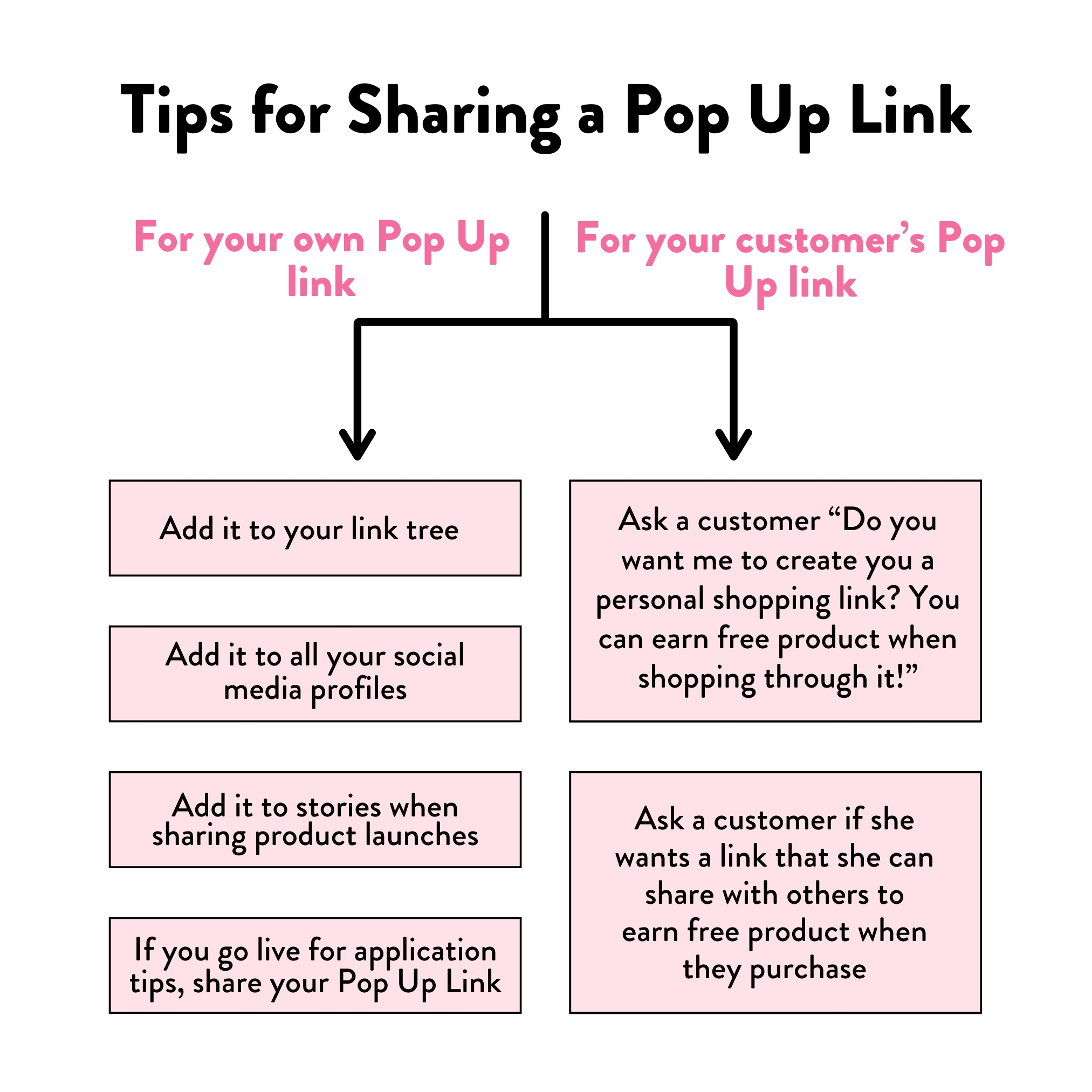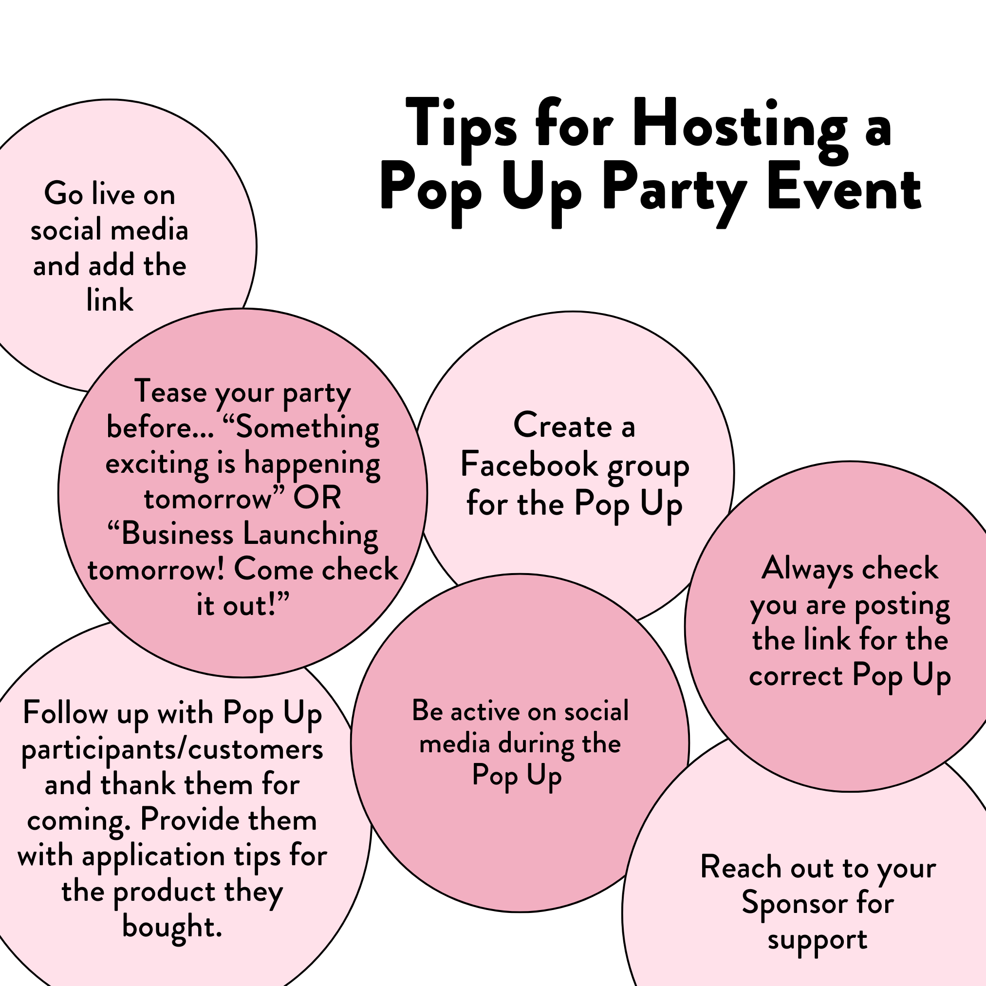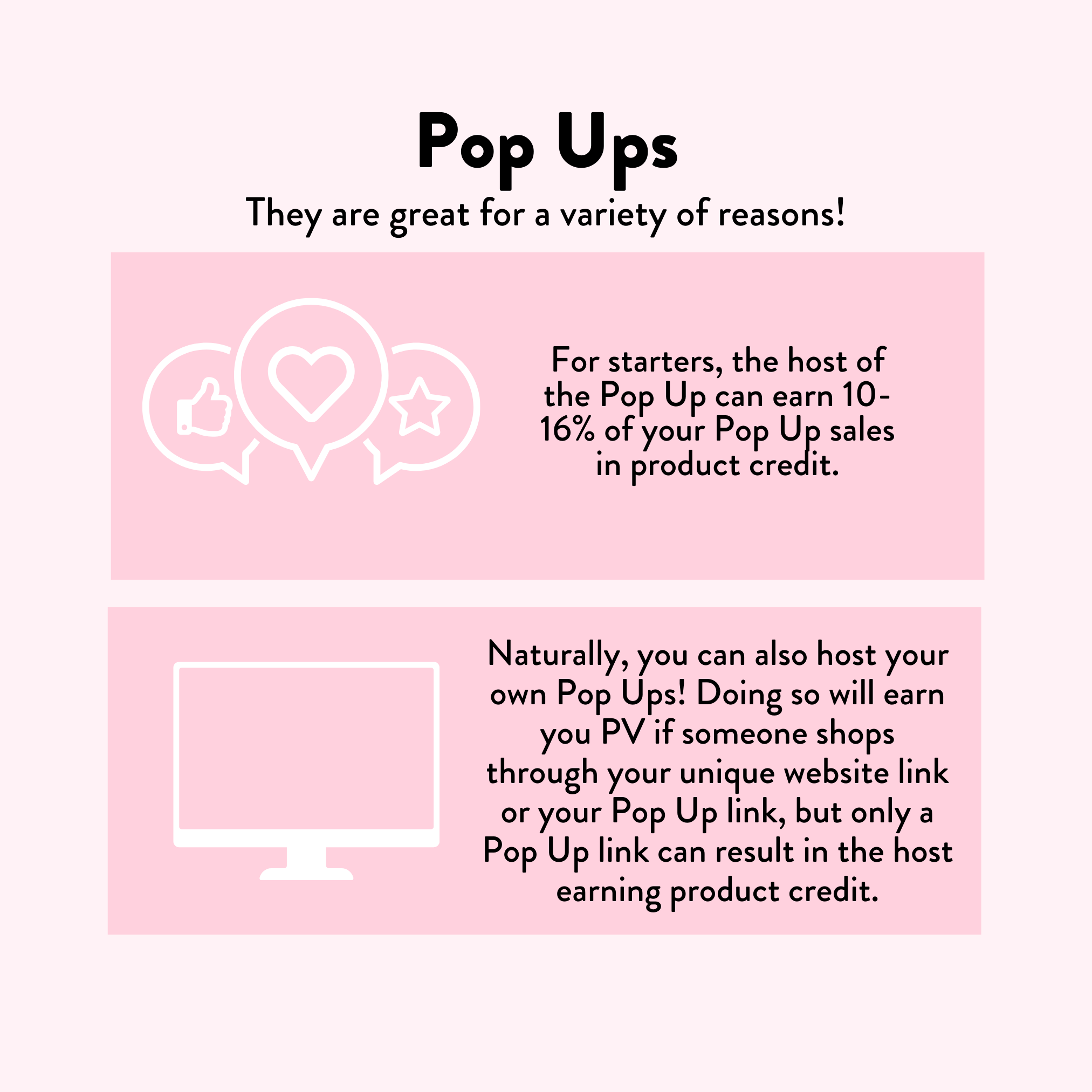 Pop Up - a unique shopping link that is shared by a host to earn product credit. Sometimes this is referred to as a Party.