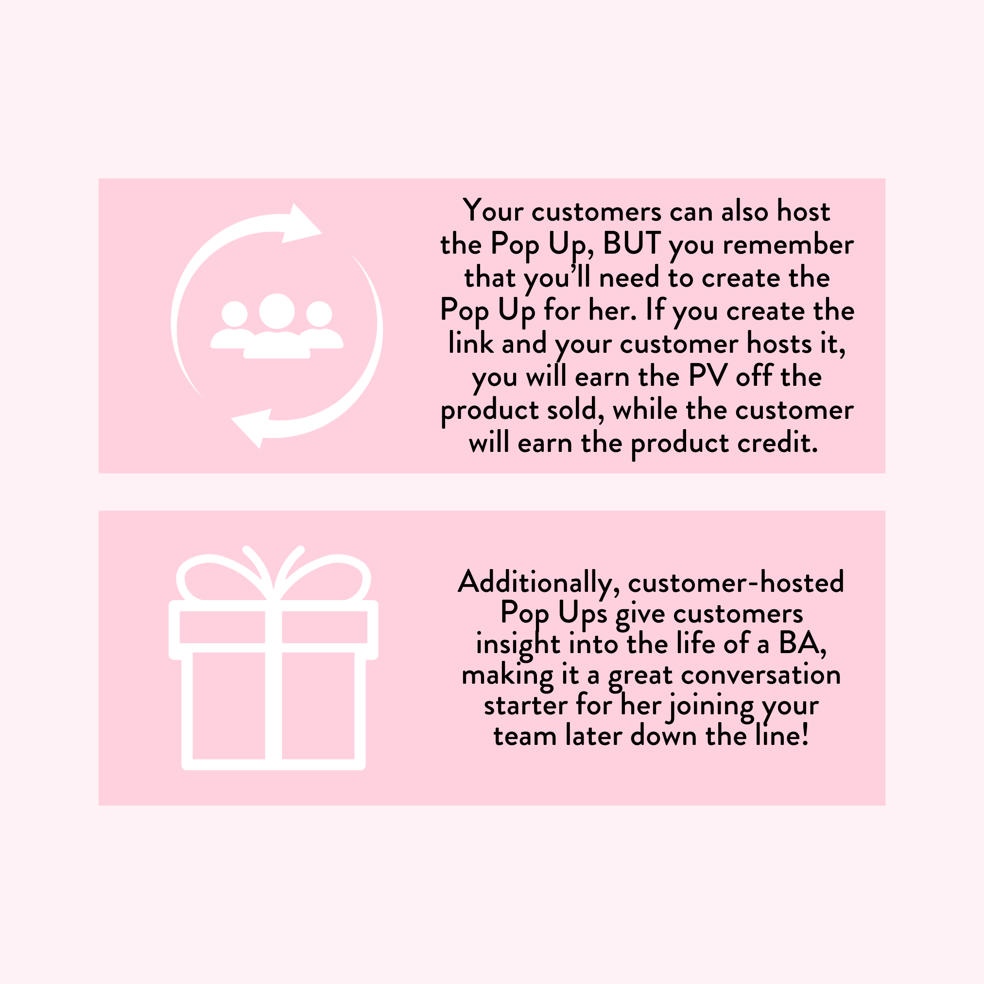 Take a look at the Pop Up Product Credit Tiers for more information. For customer hosted Pop Ups, the product credit would go to the customer who hosted it, and the Personal Volume (PV) would be attributed to you. When you host your own Pop Ups, you gain product credit in addition to the PV you earn on the product. It’s that simple! Try and commit these terms to memory: