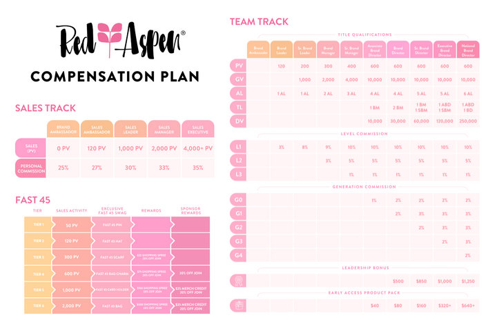 2. In addition to Fast 45, we have Leadership Fast 45 which offers individuals interested in jumping into Red Aspen’s Team Track the opportunity to earn cash bonuses during their Fast 45 period. Note that this program runs in parallel with the Fast 45, and new Brand Ambassadors are eligible to participate in both programs.
