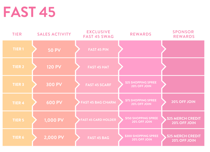 1. The Fast 45 Program is a piece of our Compensation Plan where you can earn product credit and discount joins by hitting PV goals within your first 45 days as a Brand Ambassador. Excited to get going? Find Out More.