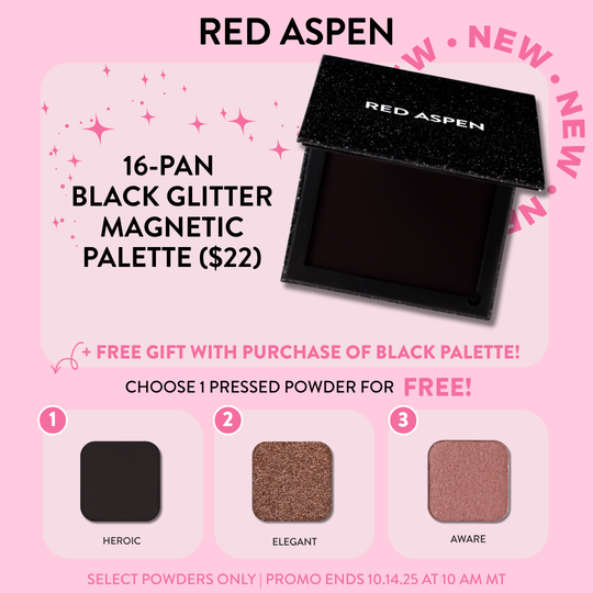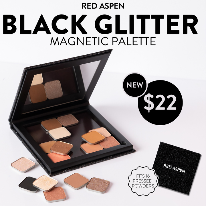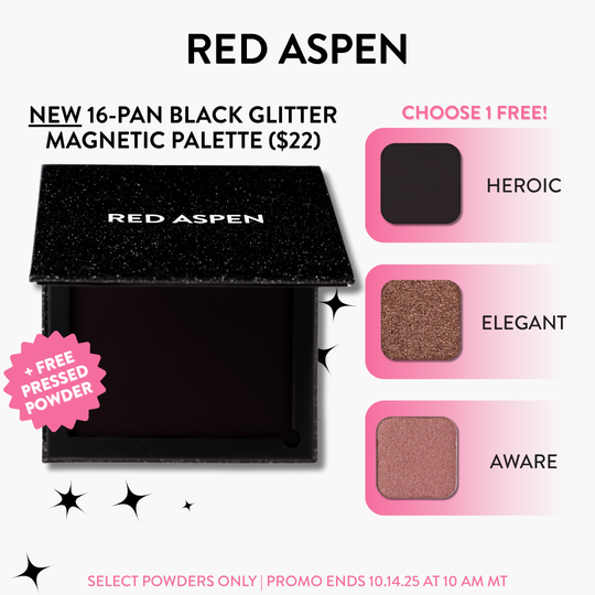 Build + save on your perfect makeup palette! Purchase our Black Glitter Magnetic Palette + pick from one of three free pressed powders: Heroic, Elegant, or Aware.