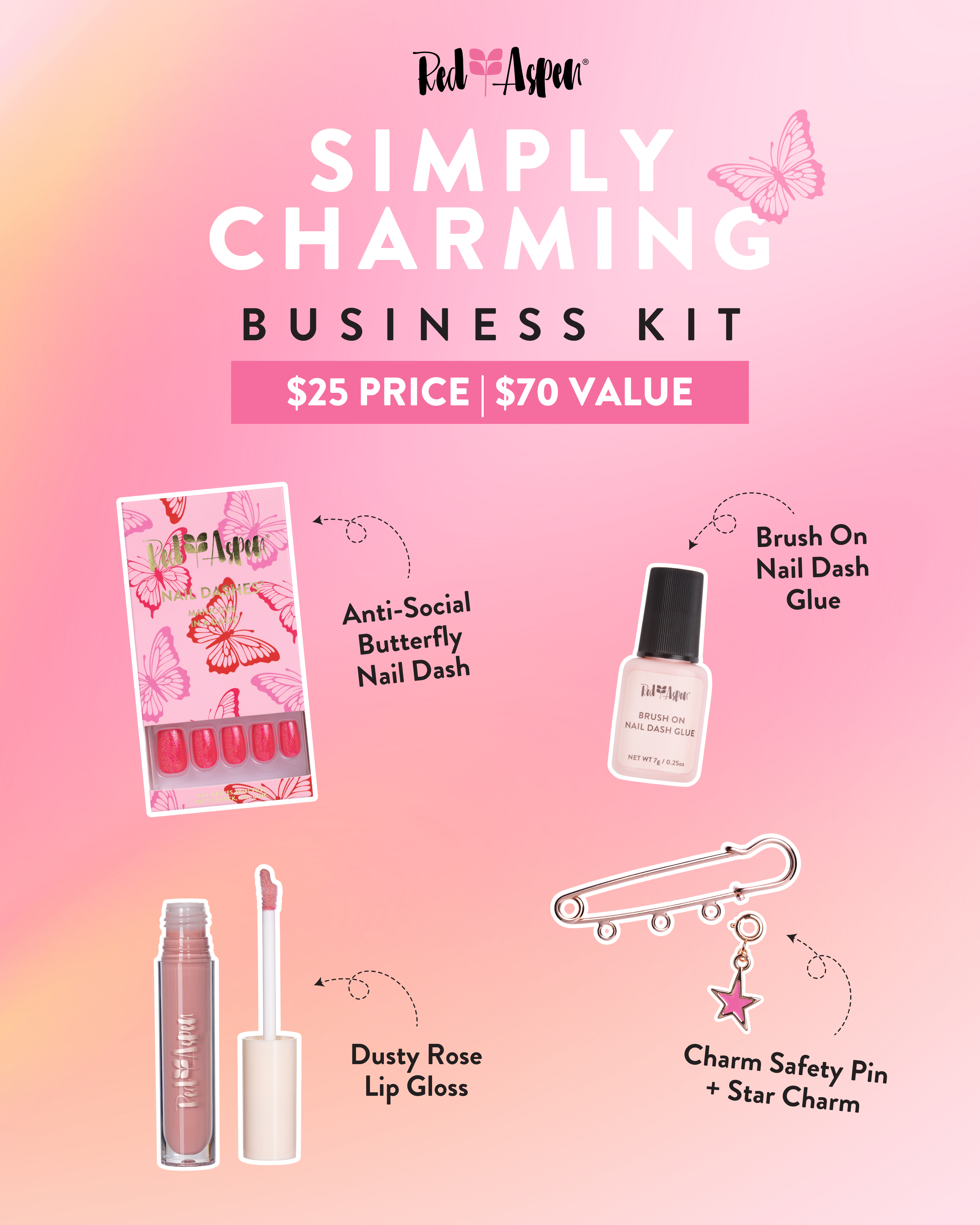 The Simply Charming Business Kit includes an Anti-Social Butterfly, Mimi Nail Dash, a Brush On Nail Dash Glue, Dusty Rose Lip Gloss, and a Charm Safety Pin with Star Charm for just $25! ($70 value)
