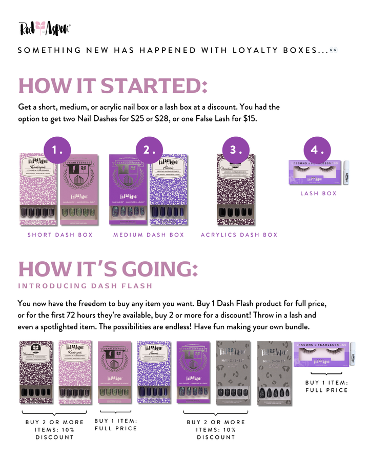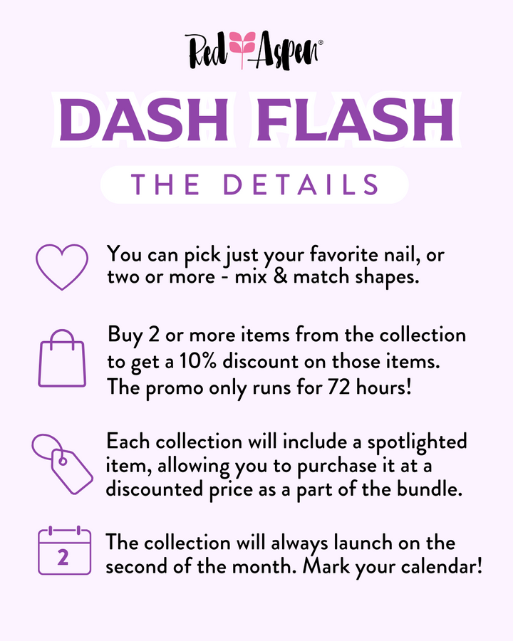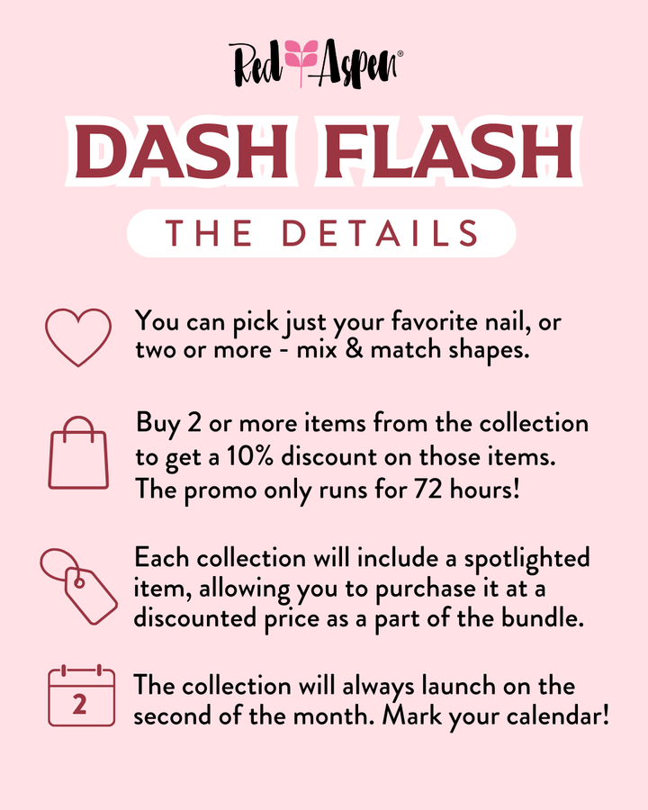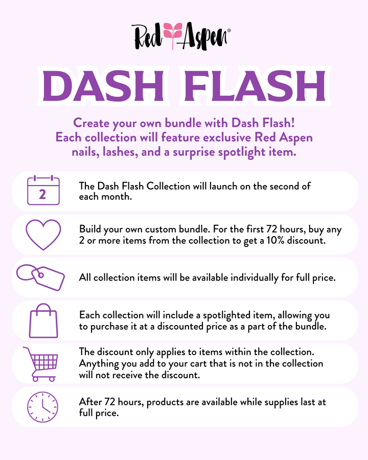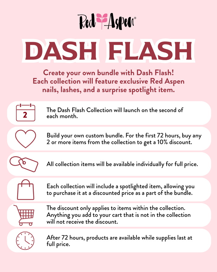 Each Dash Flash collection will feature exclusive Red Aspen nails, lashes, and a special spotlight item! It gives you the choice to buy what you want, when you want, and start each month off strong. Purchase any item from the collection at full price, or bundle two or more items and save 10% on those items.