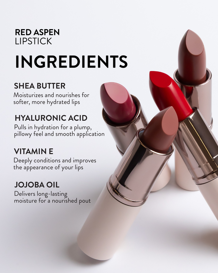 Red Aspen Lipstick is a bullet lipstick with a satin finish that’s packed with bold pigment and lip-moisturizing ingredients.