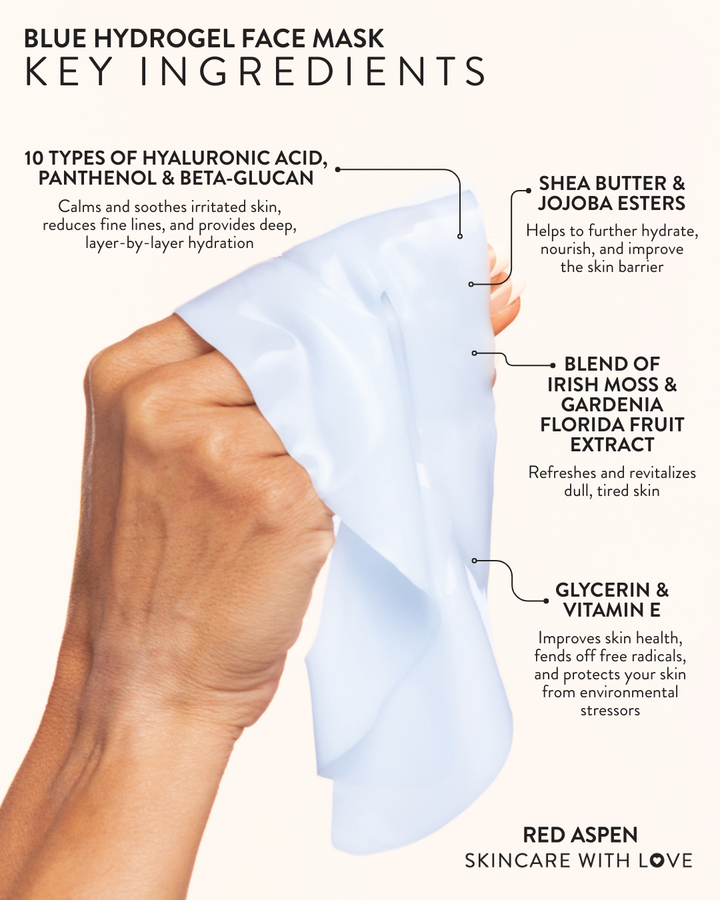 Red Aspen’s Blue Hydrogel Mask can be used several times a week, or even daily, as an addition to your AM or PM skincare routine.