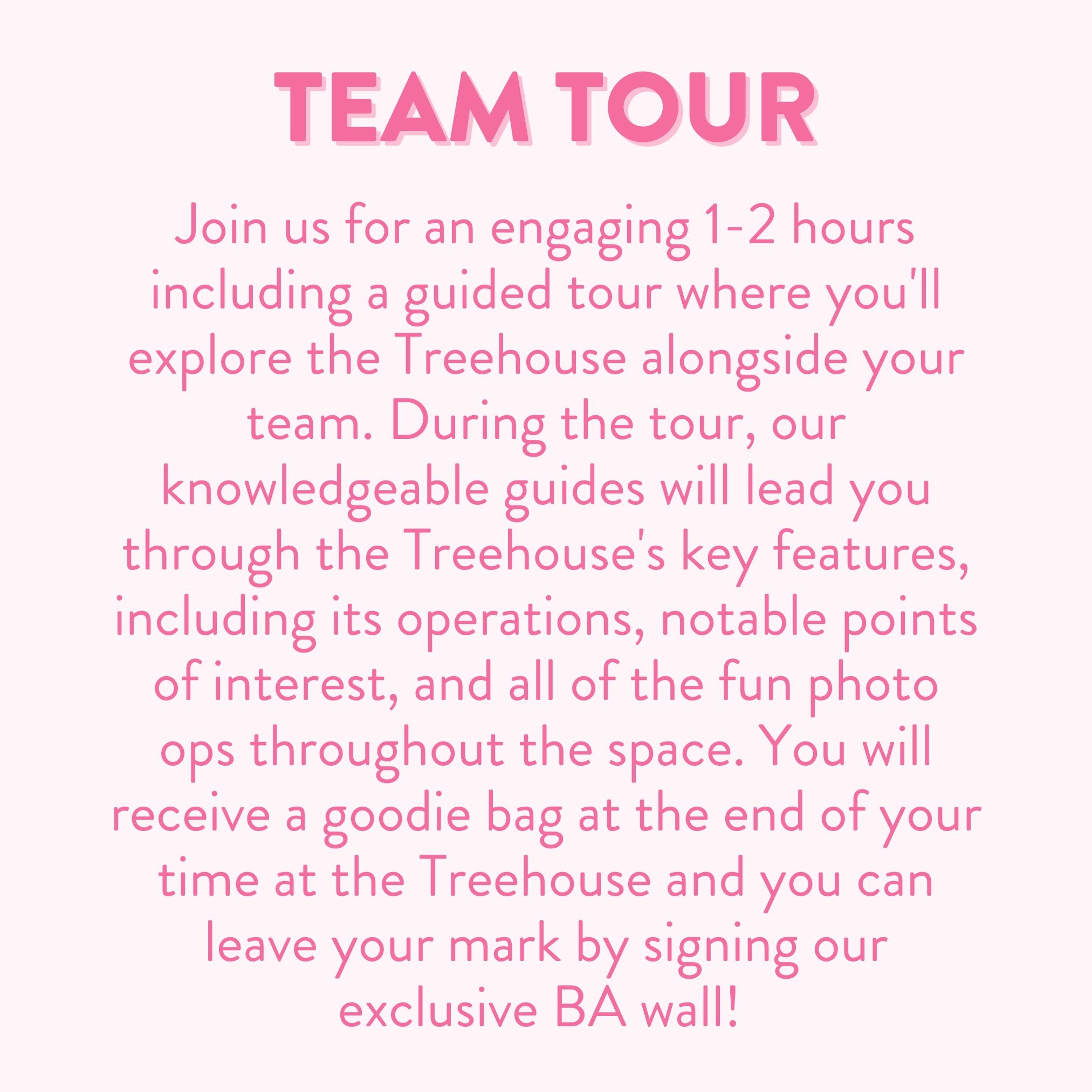Join us for an engaging 1-2 hours including a guided tour where you'll explore the Treehouse alongside your team. During the tour, our knowledgeable guides will lead you through the Treehouse's key features, including its operations, notable points of interest, and all of the fun photo ops throughout the space. You will receive a goodie bag at the end of your time at the Treehouse and you can leave your mark by signing our exclusive BA wall!