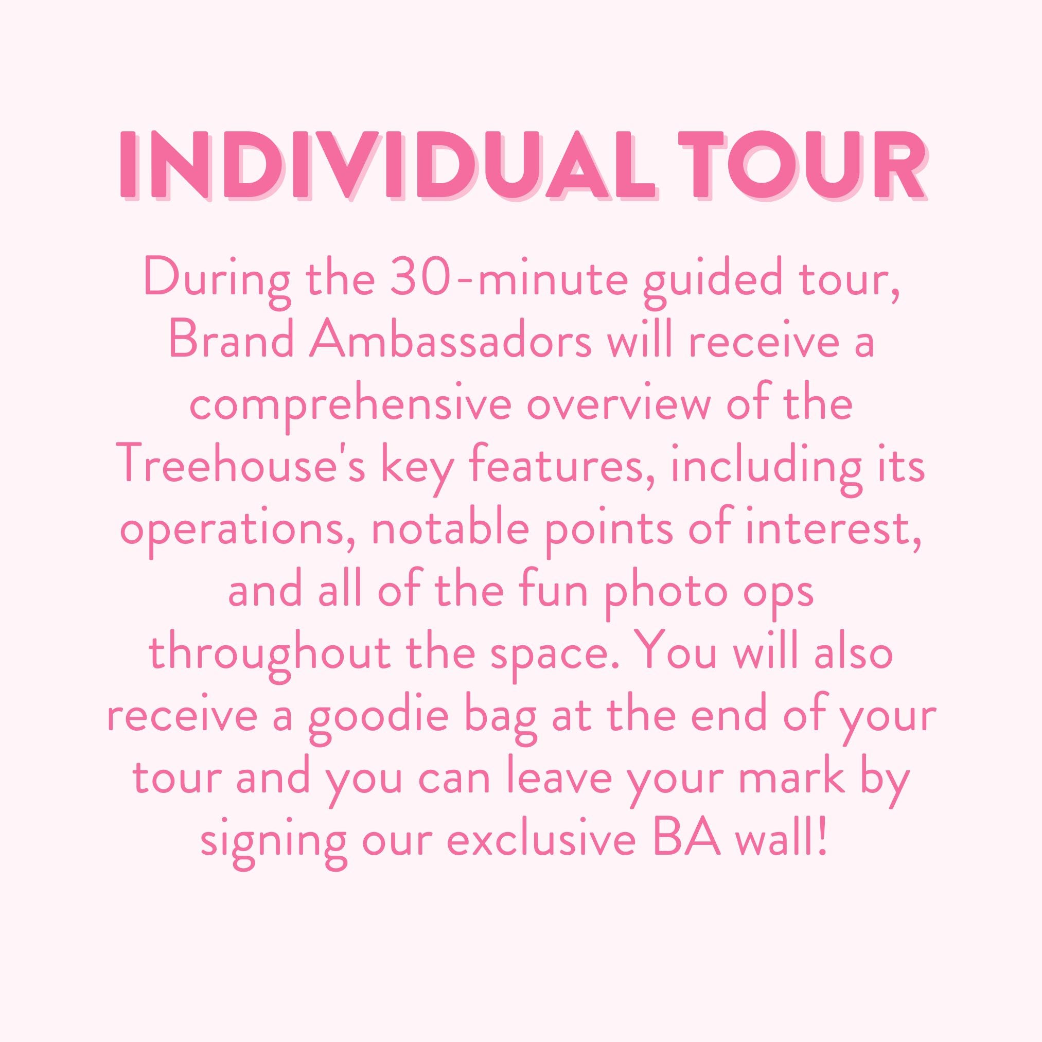During the 30-minute guided tour, Brand Ambassadors will receive a comprehensive overview of the Treehouse's key features, including its operations, notable points of interest, and all of the fun photo ops throughout the space. You will also receive a goodie bag at the end of your tour and you can leave your mark by signing our exclusive BA wall!